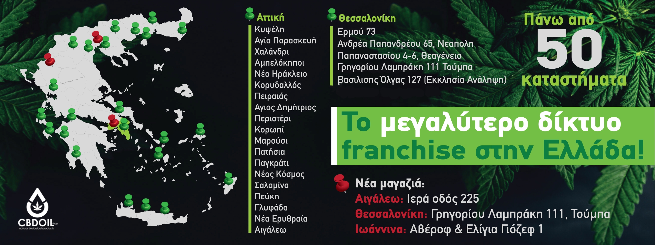 Ανακάλυψε σήμερα τα οφέλη της κανναβιδιόλης (CBD), των βοτάνων και των φυσικών ελαίων & πρόσφερε στον οργανισμό σου μια ολοκληρωμένη προστασία με τη δύναμη της φύσης. Βρες ένα κατάστημα CBD Oil Shop δίπλα σου, σε όλη την Ελλάδα και χάρισε στον εαυτό σου το δώρο της φύσης!